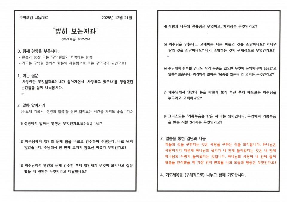 [구역예배] 구역모임 나눔지(25.12.21) 본문 구역모임 나눔지(25.12.21)구역모임 나눔지(25.12.21) 구역모임 나눔지 구름산 조회 266회 2025-12-20 23:51 가 본문내용 확대/축소 목록 댓글목록 이전글 구역모임 나눔지(25.12.28) 25.12.28 다음글 구역모임 나눔지(25.12.14) 25.12.13