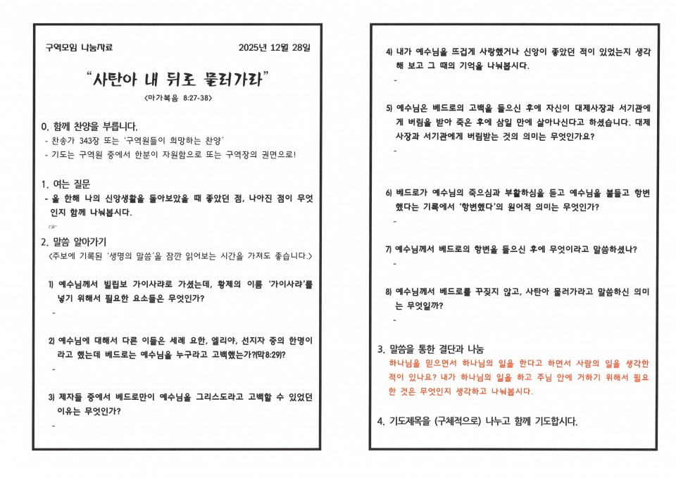 [구역예배] 구역모임 나눔지(25.12.28) 본문 구역모임 나눔지(25.12.28)구역모임 나눔지(25.12.28) 구역모임 나눔지 구름산 조회 159회 2025-12-28 08:04 가 본문내용 확대/축소 목록 댓글목록 이전글 구역모임 나눔지(26.01.11) 26.01.10 다음글 구역모임 나눔지(25.12.21) 25.12.20