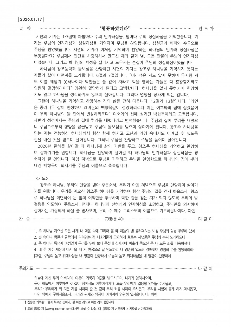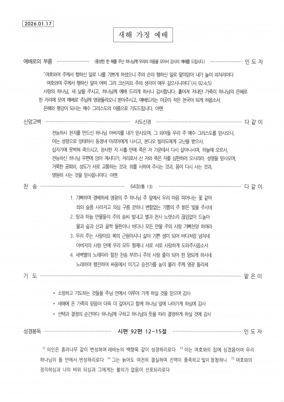 [가정예배] 설날 가정 예배 순서지(26.02.17) 본문 설날 가정 예배 순서지(26.02.17)설날 가정 예배 순서지(26.02.17) 새해 가정예배 순서지 구름산 조회 1회 2026-02-07 23:28 가 본문내용 확대/축소 목록 댓글목록 다음글 구역모임 나눔지(26.02.28) 26.02.07
