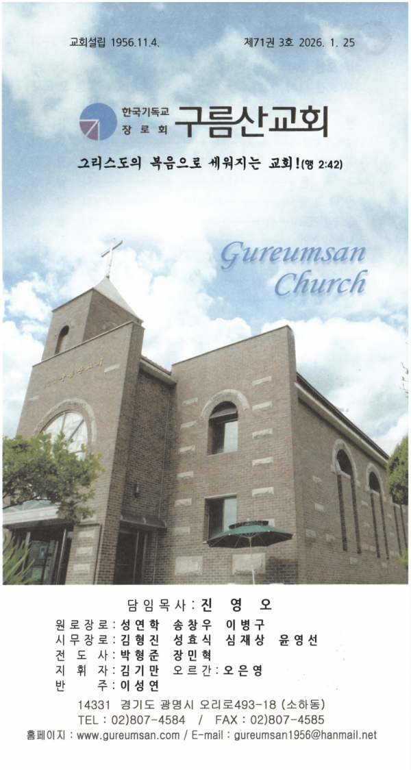 1. 환영합니다. 오늘은 주현절 셋째주일입니다. 주님 앞에 나와 예배드리시는 모든 분들을 주님의 이름으로 환영합니다. 2. 오늘 · 구역 모임: 정해진 시간과 장소 3. 주중 · 수요예배: 28일(수) 오전11시, 본당 · 금요찬양예배: 30일(금) 저녁8시, 본당 4. 다음주 · 주현절 넷째주일 · 온세대 연합예배(성찬식): 오전 11시(10시 50분부터 찬양), 본당 * 오전9시 …