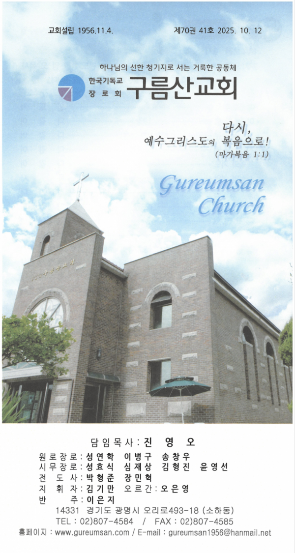 1. 환영합니다. 오늘은 창조절 여섯째 주일입니다. 주님 앞에 나와 예배드리시는 모든 분들을 주님의 이름으로 환영합니다. 2. 오늘 ·창조절 여섯째 주일 3. 주중 ·수요예배: 15일(수) 오전11시, 본당 ·금요찬양예배: 17일(금) 저녁8시, 본당 4. 다음주 ·창조절 일곱째 주일 ·3분기 정기제직회: 2부 예배 후, 본당 *안건:재건축위원회 진행사항 보고 및 제직위원회 개편 …