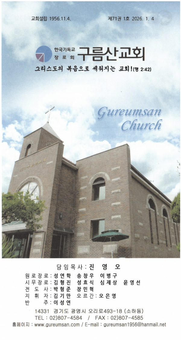 1. 환영합니다. 오늘은 성탄절 둘째주일이며, 새해주일입니다. 주님 앞에 나와 예배드리시는 모든 분들을 주님의 이름으로 환영합니다. *새교우 등록: 이성연 교우(성가대 반주자) 2. 감사 ·공동식사 대접: 이병구/송창우 장로께서 공동식사를 대접합니다. 3. 오늘 ·온세대 연합예배(성찬식): 오전 11시(10시 50분부터 찬양), 본당 ·성탄장식 정리: 오후 1시, 본당 및 외부 ·남신도회 경기중부연합회 정…