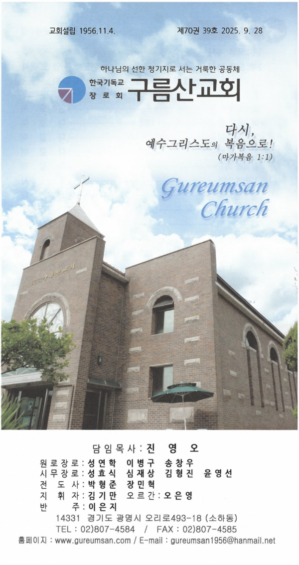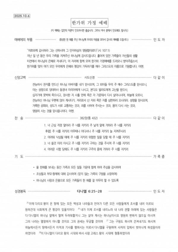 1. 환영합니다. 오늘은 창조절 넷째 주일입니다. 주님 앞에 나와 예배드리시는 모든 분들을 주님의 이름으로 환영합니다. 2. 오늘 ·장학위원회 모임: 오후 1시 30분, 카페 ·정기당회: 오후 3시, 목양실 3. 주중 ·수요예배: 1일(수) 오전11시, 본당 ·금요일 새벽기도회, 금요찬양예배: 3일(금), 명절연휴로 모이지 않습니다. 4. 다음주 ·창조절 다섯째 주일 ·온세대 연합예배(성찬식): …