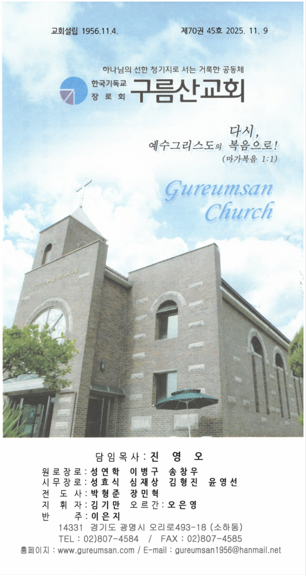 1. 환영합니다. 오늘은 창조절 열째주일입니다. 주님 앞에 나와 예배드리시는 모든 분들을 주님의 이름으로 환영합니다. 2. 오늘 ·교육관 재건축 위원회 모임: 오후 3시, 카페 3. 주중 ·추수감사 특별새벽기도회: 10일(월)~14일(금) 오전5시30분, 본당 ·수요예배: 12일(수) 오전11시, 본당 ·금요찬양예배: 14일(금) 저녁8시, 본당 5. 다음주 ·추수감사주일 예배: 오전 9시, 11시 예배 &…