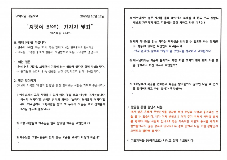 [구역예배] 구역모임 나눔지(25.10.12) 본문 구역모임 나눔지(25.10.12)구역모임 나눔지(25.10.12) 구역모임 나눔지입니다. 구름산 조회 104회 2025-10-11 17:44 가 본문내용 확대/축소 목록 댓글목록 이전글 구역모임 나눔지(25.10.19) 25.10.18 다음글 2025년 추석 가정예배지 25.09.27