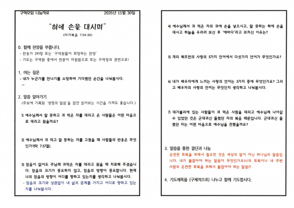 [구역예배] 구역모임 나눔지(25.11.30) 본문 구역모임 나눔지(25.11.30)구역모임 나눔지(25.11.30) 구역모임 나눔지 구름산 조회 109회 2025-11-30 01:22 가 본문내용 확대/축소 목록 댓글목록 이전글 구역모임 나눔지(25.12.14) 25.12.13 다음글 구역모임 나눔지(25.11.16) 25.11.16