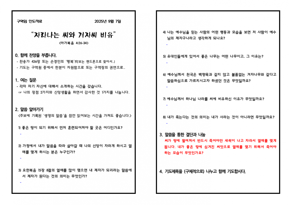 [구역예배] 구역모임 나눔지(25.09.07) 본문 구역모임 나눔지(25.09.07)구역모임 나눔지(25.09.07) 구역 모임 나눔지입니다. 구름산 조회 530회 2025-09-06 15:40 가 본문내용 확대/축소 목록 댓글목록 이전글 구역모임 나눔지(25.09.14) 25.09.13 다음글 구역 편성 안내 25.09.06